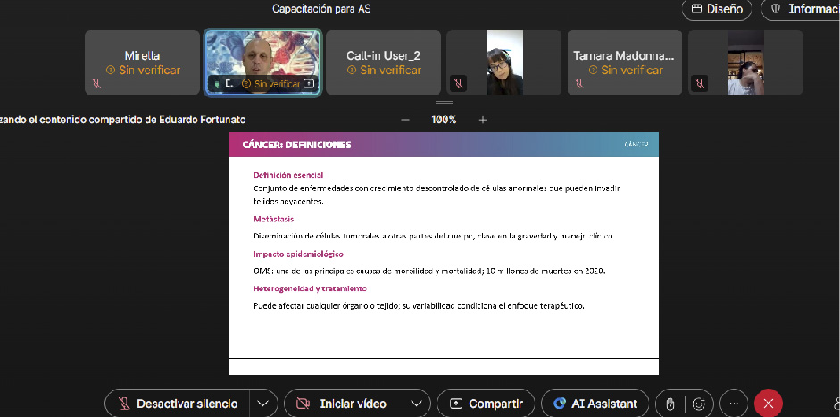 Durante la capacitación se trabajaron nociones generales sobre la enfermedad, sus principales características y su impacto en la salud, así como las diferencias entre células normales y cancerosas. También se abordó cómo se origina en el organismo, los factores que influyen en su desarrollo y la importancia de la detección precoz. Se puso el foco en las medidas promo-preventivas, abordando factores como el consumo de tabaco y alcohol, la alimentación inadecuada, la obesidad, ciertas infecciones y la exposición ambiental u ocupacional.
