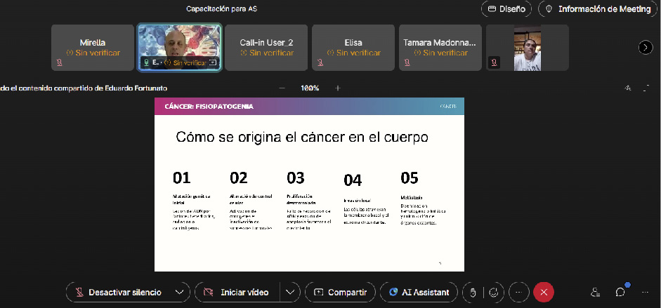 El objetivo del encuentro fue fortalecer el abordaje integral de la enfermedad y acompañar las visitas domiciliarias a afiliadas y afiliados oncológicos, que se desarrollarán durante el mes de febrero. La actividad se realizó de manera virtual a través de la plataforma Webex y estuvo a cargo del médico epidemiólogo, Eduardo Fortunato, quien brindó una charla sobre los fundamentos generales del cáncer, con especial énfasis en la prevención, la detección temprana y los factores de riesgo.
