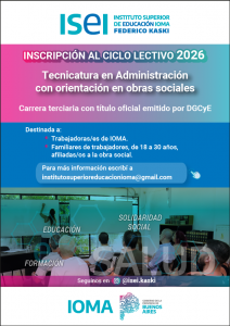 El próximo jueves 28/09 se realizará un acto de colación en el Instituto de Educación Superior IOMA Federico Kaski. Recibirán sus diplomas seis trabajadoras y trabajadores de la obra social, que iniciaron sus estudios antes de que el ISEI fuera cerrado -durante la gestión de María Eugenia Vidal- y durante el periodo 2022/23 pudieron completar sus estudios. De esta manera, recibirán el título correspondiente a la Tecnicatura Superior en Administración con orientación en Obras Sociales.